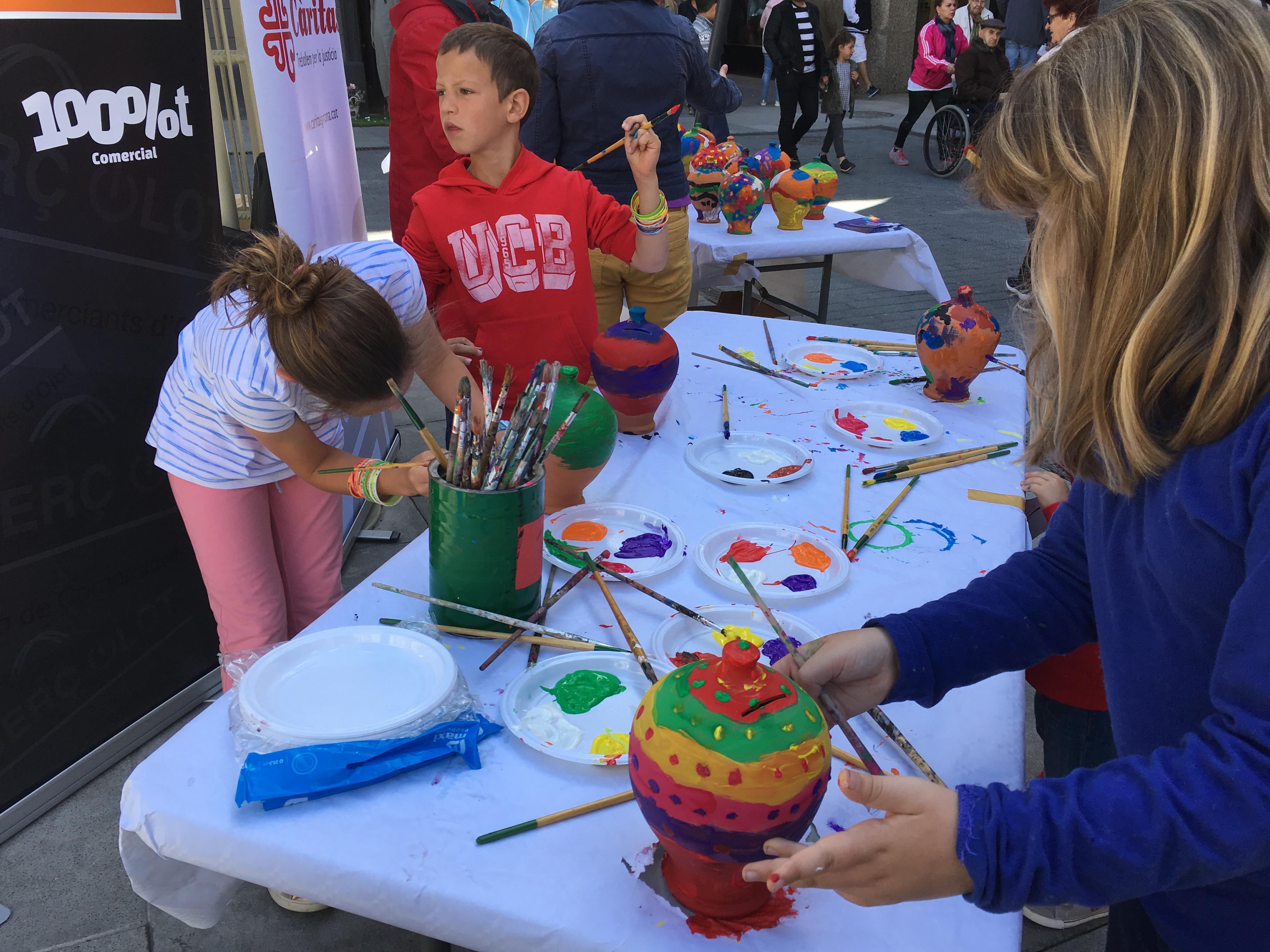 Un any més, en el marc de la Fira de Primavera, el 1r de Maig, a Olot, s'ha dut a terme la pintada de guardioles que, a hores d'ara, ja són repartides per divesos comerços d'Olot i rodalies, i que estan "esperant el canvi" al llarg de tot aquest mes. D'aquí ve el lema de la campanya: "No et quedis el canvi". Aquestes guardioles se sumen a les que van pintar el mes passat els nens/nenes de tres escoles (Sant Roc, d'Olot, "El Castanyer" de Sant Joan Les Fonts, i "Castellroc" de Castellfollit de la Roca). El temps hi va acompanyar, i l'ambient va ser molt animat. Tant que en qüestió d'una d'hora, van quedar llestes i pintades les 60 guardioles que faltaven per pintar. Una vegada més donem les gràcies, des de Càritas Garrotxa, a tothom que hi ha participat, fent possible aquesta activitat. Especialment agraïm la col·laboració activa de l'ACO (Associació de Comerciants d'Olot) i l'Escola Municipal d'Expressió d'Olot. Els uns per facilitar mitjans i dades, per a aquesta activitat, i als altres per l'elaboració del cartell i pel seu assessorament en el conjunt de la pintada. Us deixem una mostra fotogràfica. La propera activitat serà, si Déu vol, el dia 02 de Juny, que es durà a terme la trencada de guardioles a l'escola Sant Roc, d'Olot.